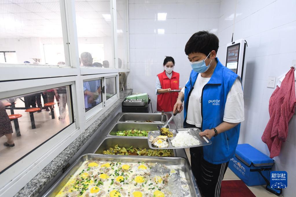 5月30日,在埭溪镇中央食堂,工作人员为老年人打饭。