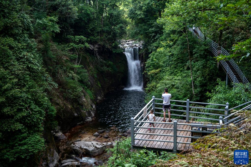 5月29日,游客在坪河草地景区一观景台拍摄瀑布。
