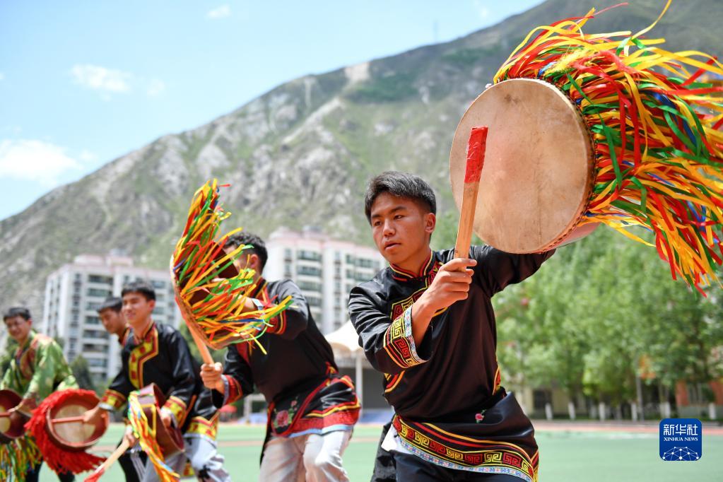 5月30日,四川省汶川中学高三学生用羌族羊皮鼓舞“减压”迎高考。