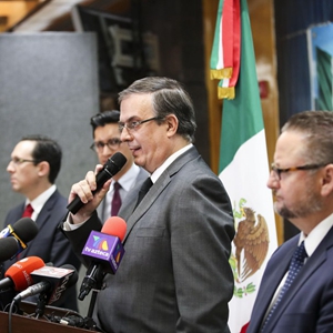 2019年8月5日,在美国得克萨斯州埃尔帕索的墨西哥驻埃尔帕索领事馆,墨西哥外长埃布拉德(左三)在记者会上讲话。新华社记者王迎摄