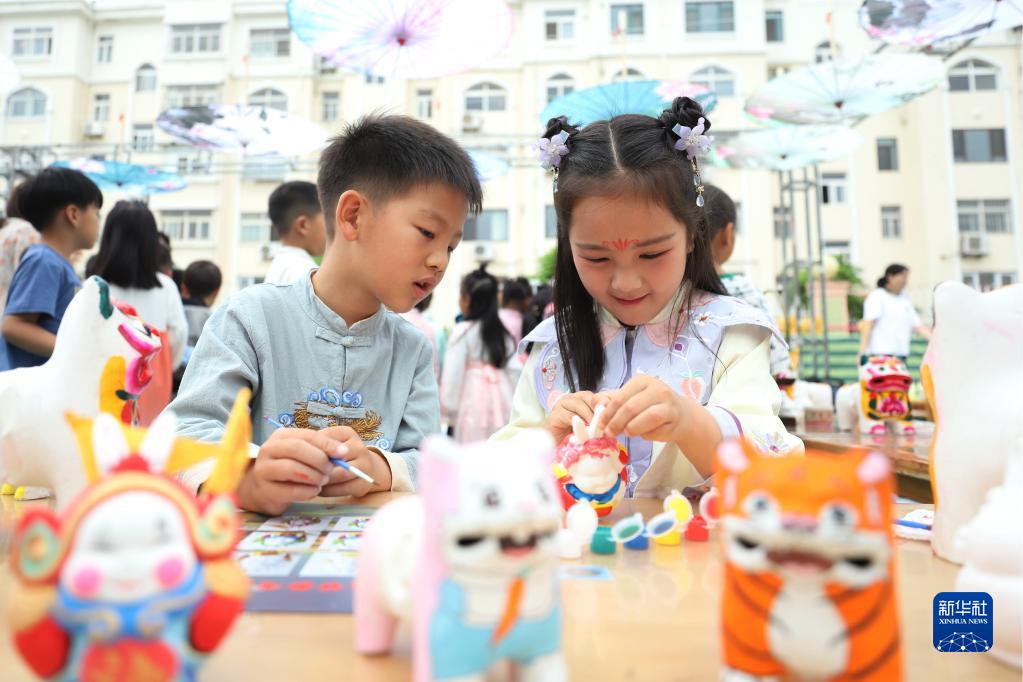 5月30日,在山东省青岛西海岸新区滨海新村幼儿园,小朋友在制作兔儿爷手工制品。