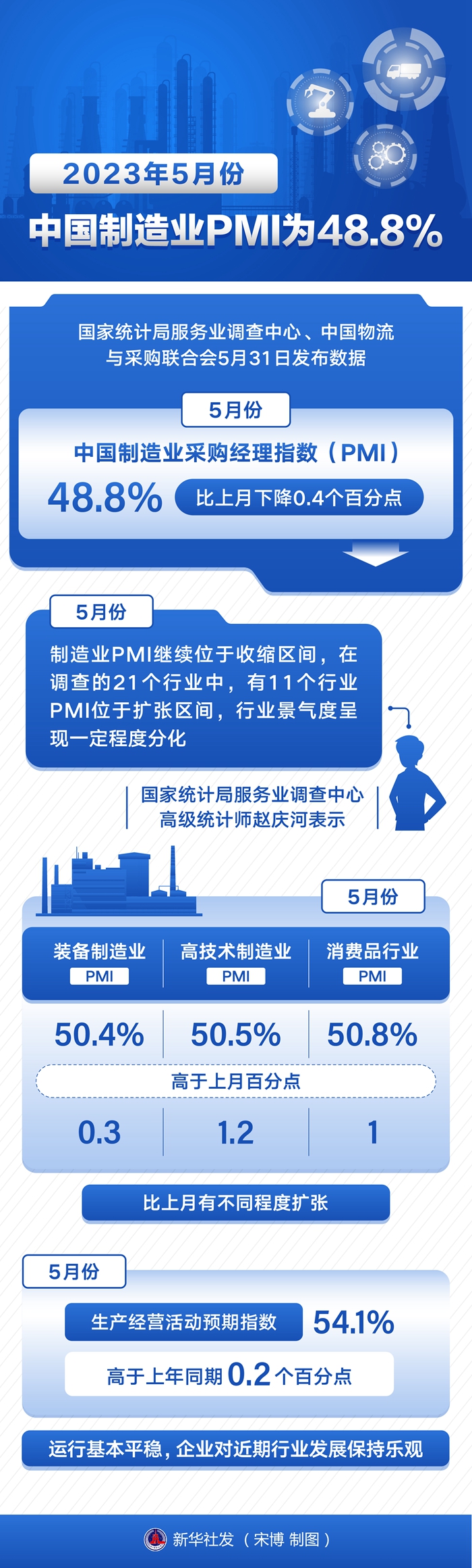 新华社北京5月31日电(记者魏玉坤、魏弘毅)国家统计局服务业调查中心、中国物流与采购联合会5月31日发布数据,5月份,中国制造业采购经理指数(PMI)为48.8%,比上月下降0.4个百分点。