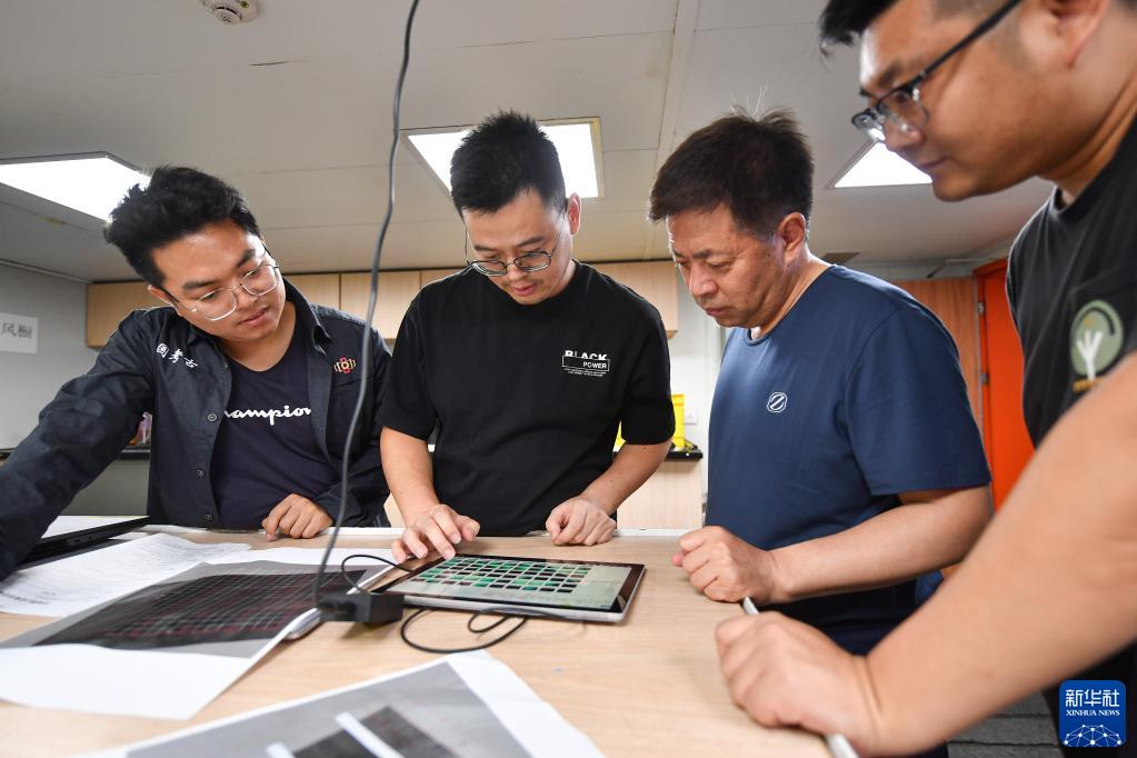 考古队员在“探索一号”科考船上查看从水下采集的考古数据(5月24日摄)。
