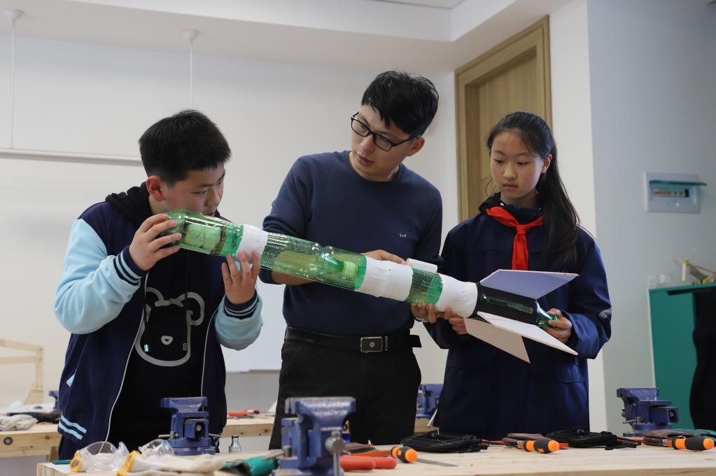 科普“网红”王印(中)与孩子们一起用塑料瓶制作“火箭”。(受访者供图)