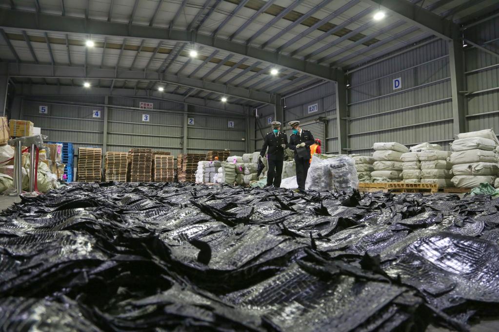 宁波海关关员清点查获的走私鳄鱼皮。(向恋梅 摄)