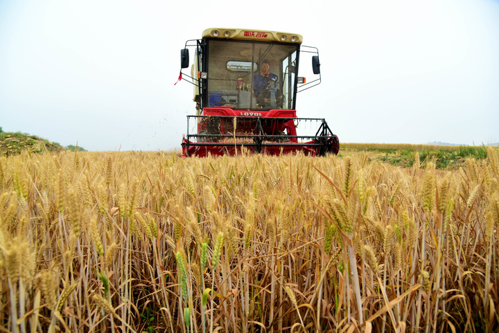 5月27日,农机手驾驶收割机在山东省枣庄市山亭区桑村镇任庄村的麦田抢收小麦。新华社发(刘明祥 摄)