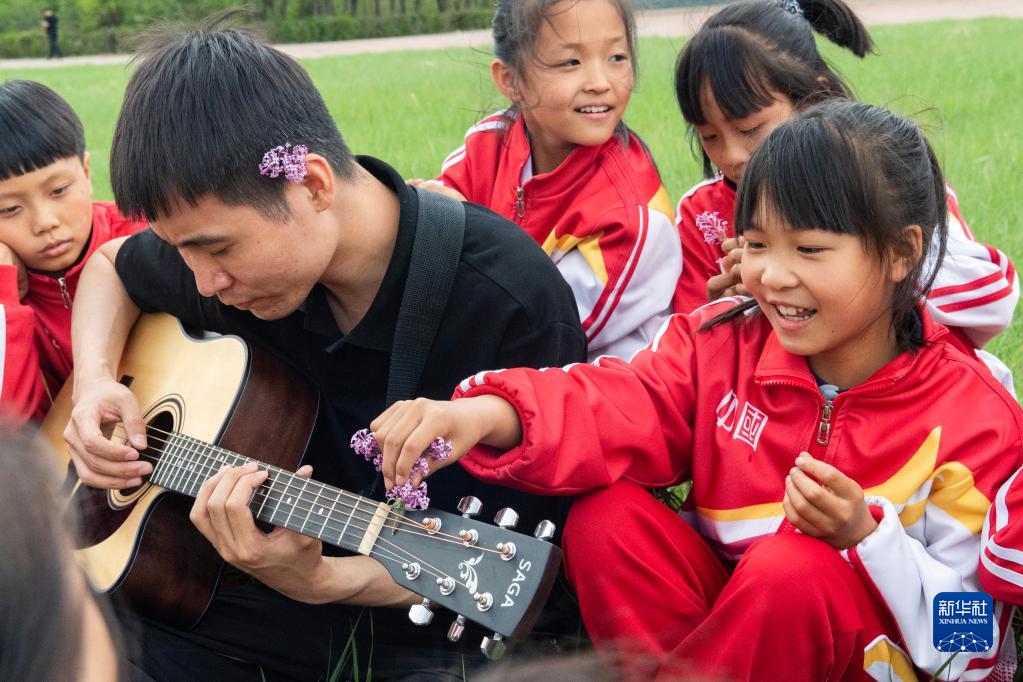 5月29日,在黑龙江省安达市任民镇中心小学校园的草坪上,音乐班的孩子与音乐老师李平互动。新华社记者 谢剑飞 摄