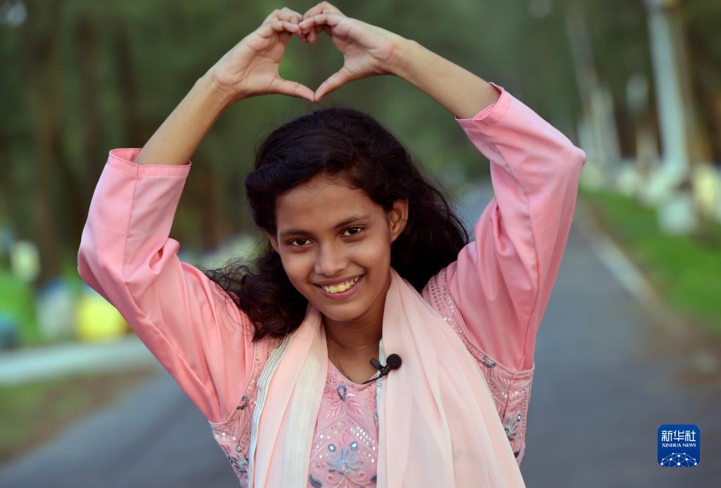 5月26日,在孟加拉国首都达卡,阿里法·沁做出爱心手势表达对中国的爱意。新华社发