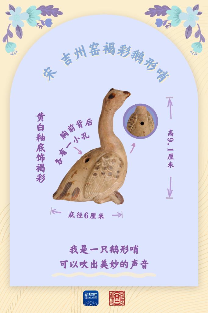 鹅形哨出土于江西吉安的宋代吉州窑遗址。吉安市博物馆馆长李希朗说,吉州窑的瓷土粗松,有近似于陶的特点,可塑性较强。这里出土的瓷塑大多不超过10厘米,动物瓷塑的原型多为社会生活中所常见。从出土的瓷塑数量来看,吉州窑当年的订单量很大,颇受市场欢迎。也许每一只鹅形哨的背后,都有一名鼓着腮帮子的稚童。历经时光荏苒,鹅形哨到今天还能发出动听的哨音。