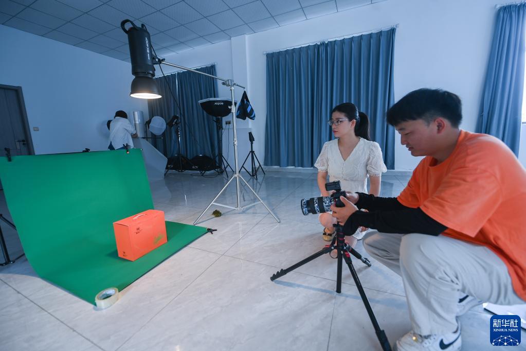 6月1日,洪洁(后)在位于湖州市织里镇的蟹临门农业科技开发有限公司内和工作人员一起拍摄产品宣传照片。洪洁毕业于美国纽约州立大学,通过招商引资的形式,来到浙江省湖州市织里镇,投资湖州蟹临门农业科技开发有限公司。