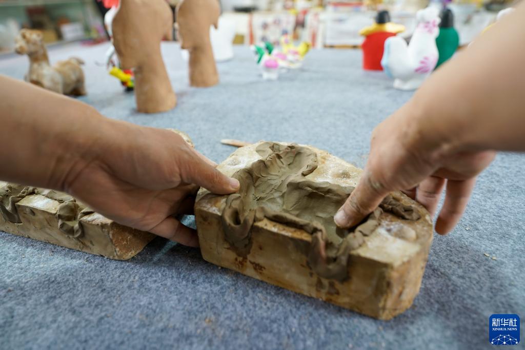6月1日,泥塑艺人在河北省玉田县亮甲店镇的一家泥塑工作室内制作泥塑。
