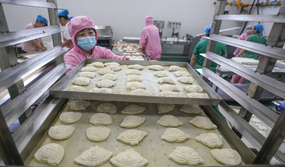 5月23日,工人在沧州渤海新区黄骅市河北银海农业科技有限公司面食生产车间搬运面花。新华社记者 骆学峰 摄