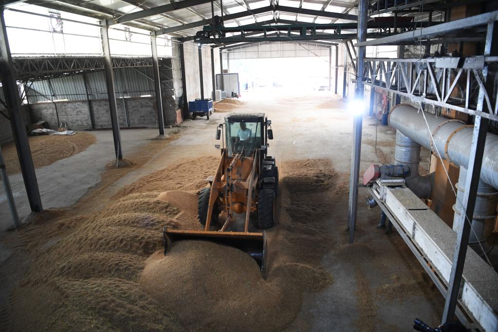 5月30日,在河南省驻马店市正阳县大林镇一家烘干加工合作社,工作人员驾驶车辆将湿麦推入烘干机入料口。新华社记者 张浩然 摄
