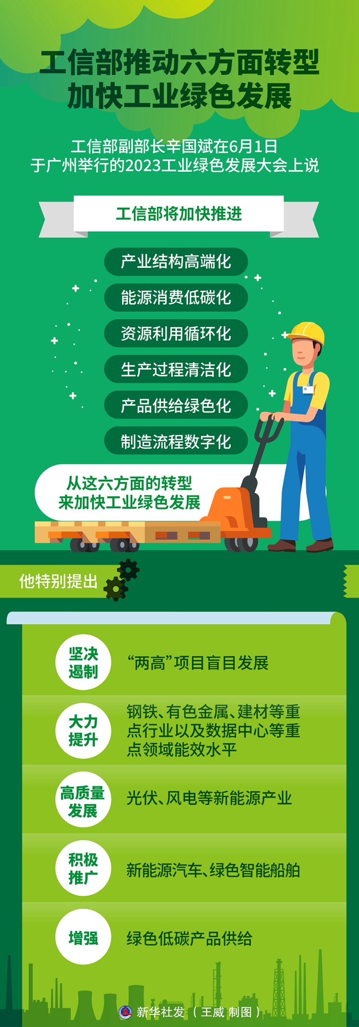 新华社广州6月1日电(记者张辛欣、王浩明)工信部副部长辛国斌在1日于广州举行的2023工业绿色发展大会上说,要通过加快推进产业结构高端化、能源消费低碳化、资源利用循环化、生产过程清洁化等六方面转型,全面推进工业绿色发展,将工业绿色发展作为新型工业化的重点,打造绿色新动能。