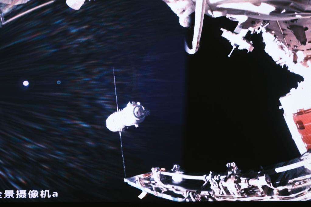5月30日在北京航天飞行控制中心拍摄的神舟十六号载人飞船与天和核心舱进行自主快速交会对接的画面。新华社记者 李杰 摄