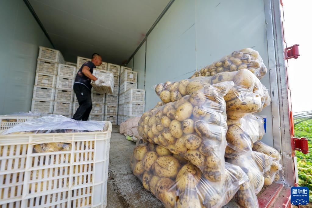 6月1日,农民在河北省玉田县玉田镇一处供京蔬菜基地内将收获的马铃薯装车。