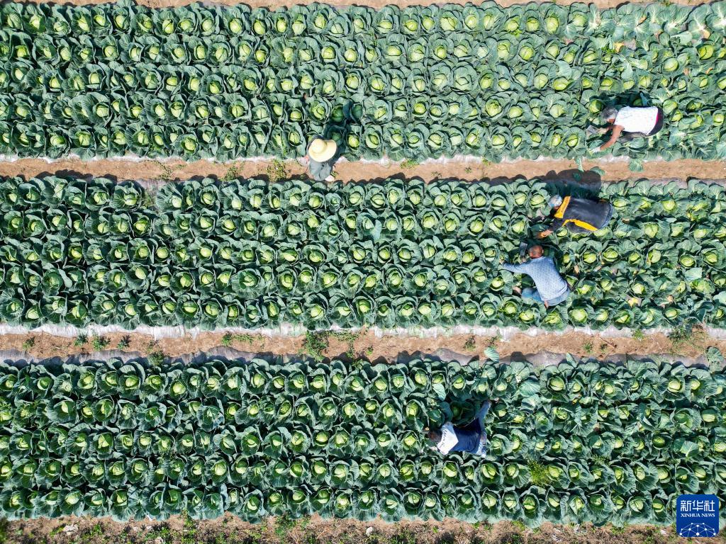 6月1日,农民在河北省玉田县虹桥镇一处供京蔬菜基地内收获甘蓝(无人机照片)。