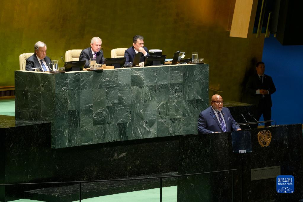 6月1日,在位于纽约的联合国总部,特立尼达和多巴哥常驻联合国代表丹尼斯·弗朗西斯当选第78届联合国大会主席后发表讲话。新华社发(联合国供图/洛伊·费利普摄)