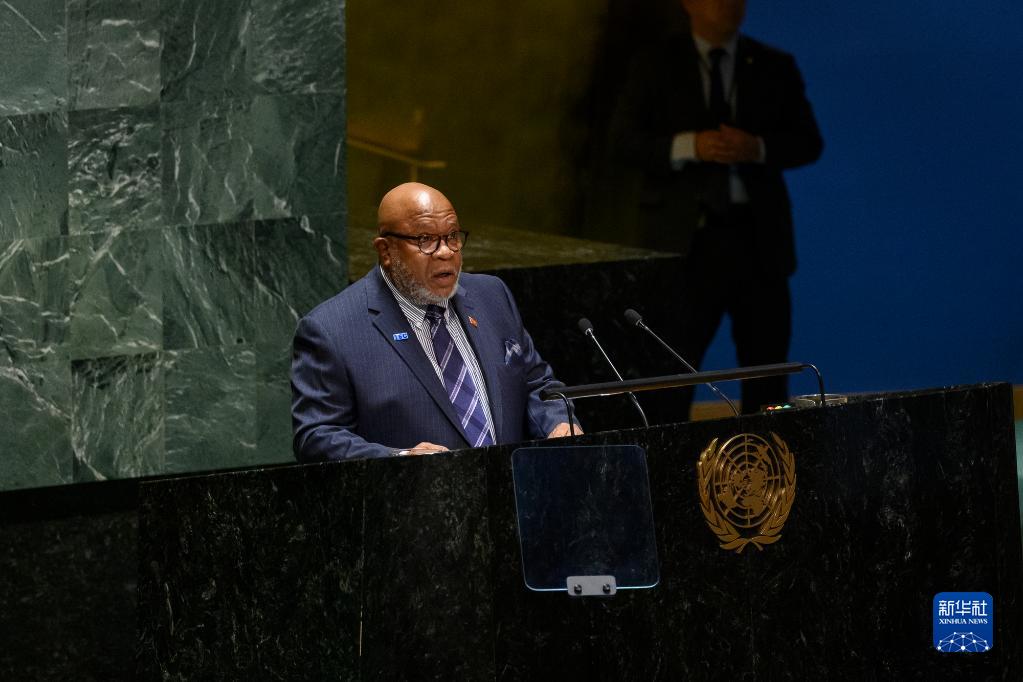 6月1日,在位于纽约的联合国总部,特立尼达和多巴哥常驻联合国代表丹尼斯·弗朗西斯(前)当选第78届联合国大会主席后发表讲话。新华社发(联合国供图/洛伊·费利普摄)