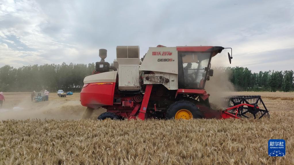 6月2日,在河南省开封市龙亭区北郊乡宁陵屯村,农机手操作收割机在田间收割小麦。