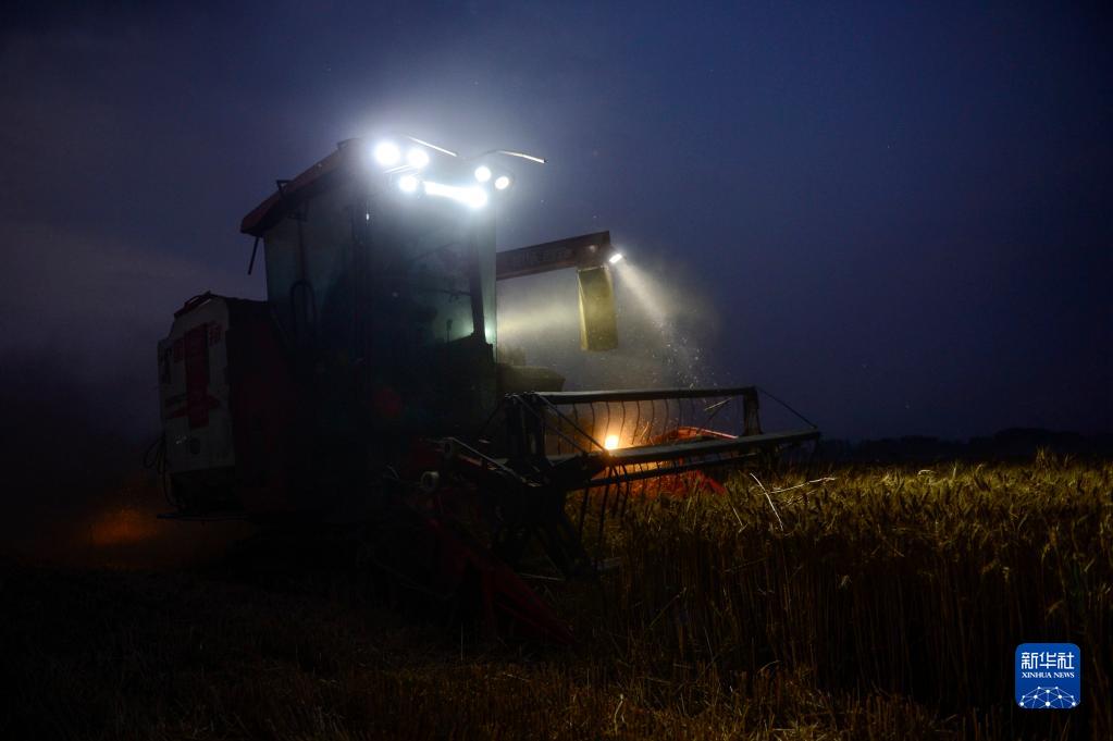 6月1日晚,在河南省驻马店市汝南县老君庙镇,农民操作收割机抢收小麦。