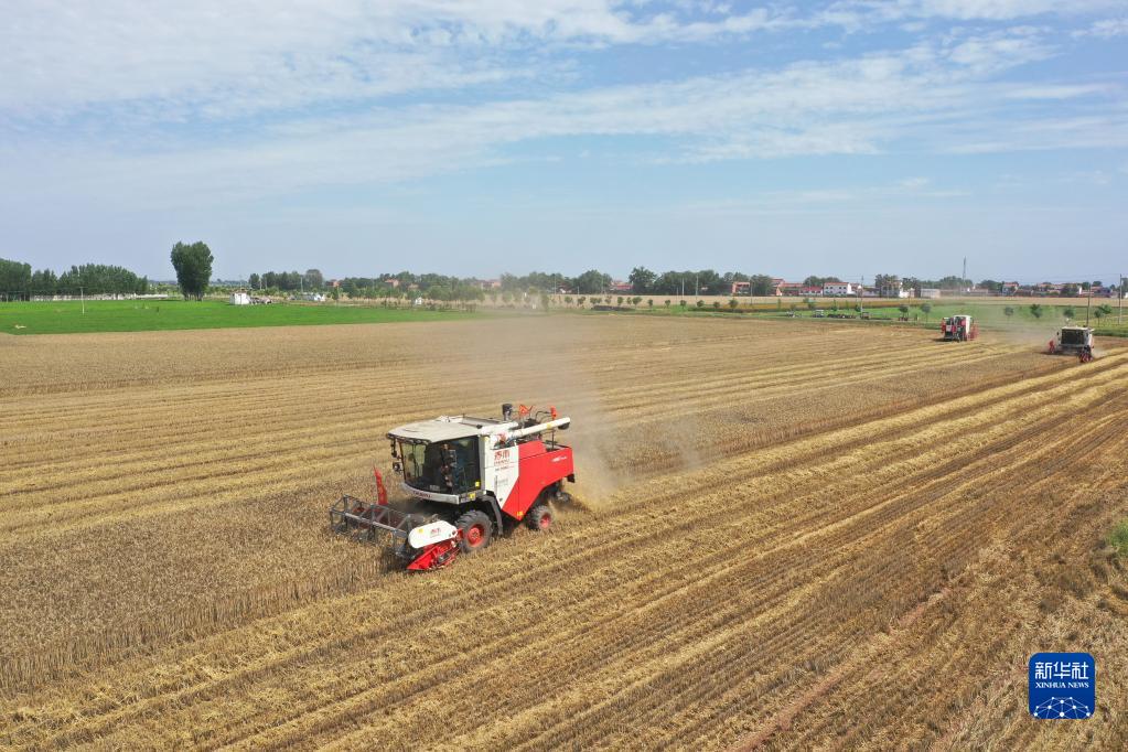 6月1日,河南省焦作市温县武德镇徐堡村村民驾驶收割机在田间收小麦(无人机照片)。