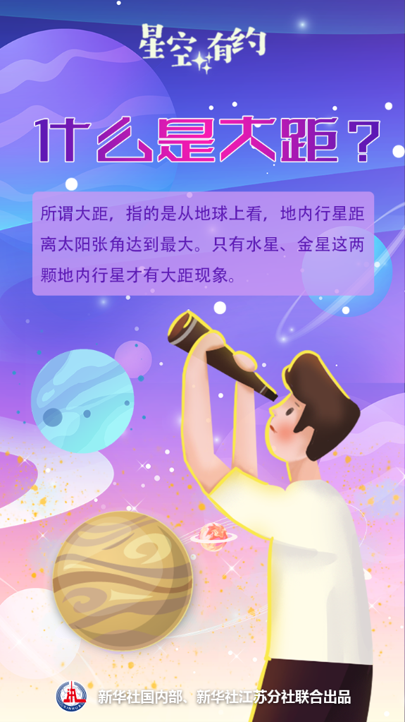 中科院紫金山天文台科普主管王科超介绍,在太阳系行星之中,水星、金星的公转轨道在地球内侧,属于地内行星,大距正是这种地内行星所特有的现象。所谓大距,指的是从地球上看,地内行星距离太阳张角达到最大。在一个会合周期里,地内行星在太阳东、西两侧各会发生一次大距,分别被称为东、西大距。大距发生前后,也是观赏地内行星的好时机。