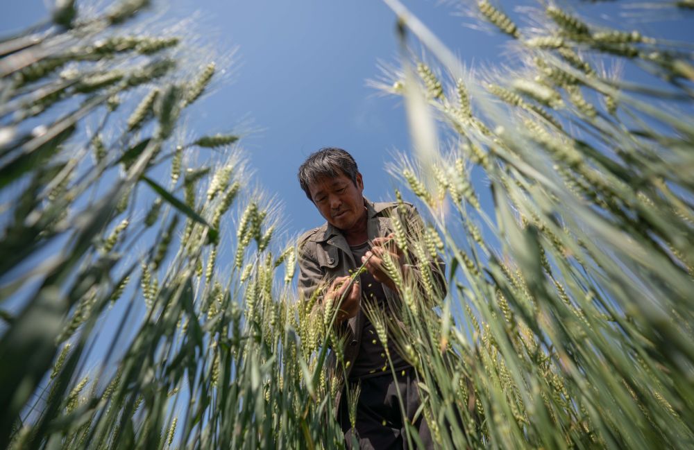 5月23日,农民在河北沧州渤海新区黄骅市福源种植合作社的麦田里查看盐碱地小麦长势。新华社记者 骆学峰 摄
