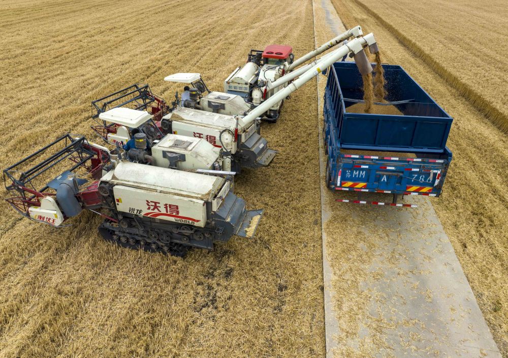 5月30日,在江苏省泰州市姜堰区顾高镇塘桥村,农民在田间将小麦装车(无人机照片)。新华社发(汤德宏 摄)