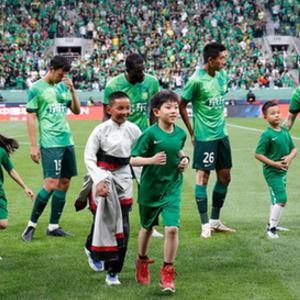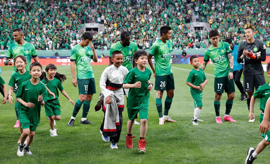 6月2日,孩子们作为球童与国安球员共同出场。新华社记者陈钟昊摄