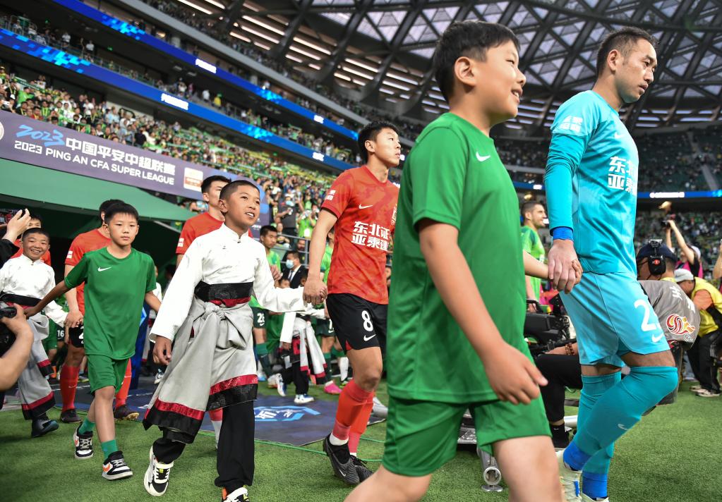 新华社北京6月2日电(记者 夏子麟)2日晚北京国安国安主场对阵长春亚泰的中超联赛,“新工体”迎来了6名特别的小球童。他们身着藏族传统服饰,与球员手牵手步入球场。和6位小球童一同来到“新工体”的还有另外34名小伙伴,他们是来自青海省玉树藏族自治州儿童福利院的足球少年们。