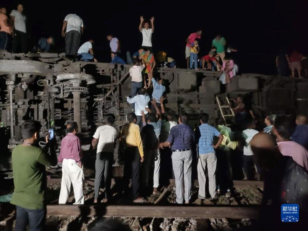 6月2日,人们聚集在印度奥迪沙邦巴拉索尔地区的列车脱轨相撞事故现场。新华社/印度联合新闻社