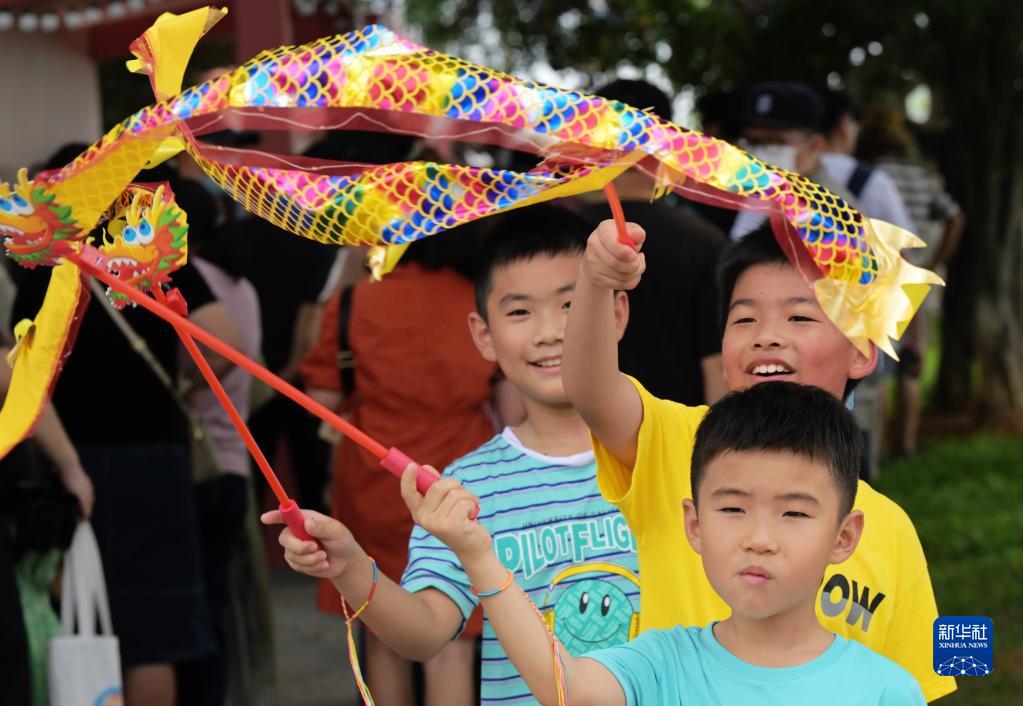 6月3日,厦门小学生在2023海峡两岸(集美)龙舟文化节活动现场体验舞龙。