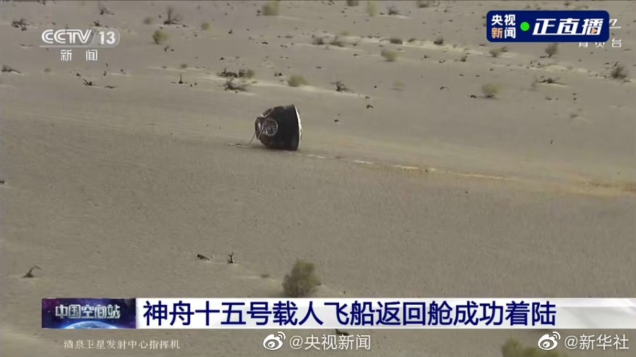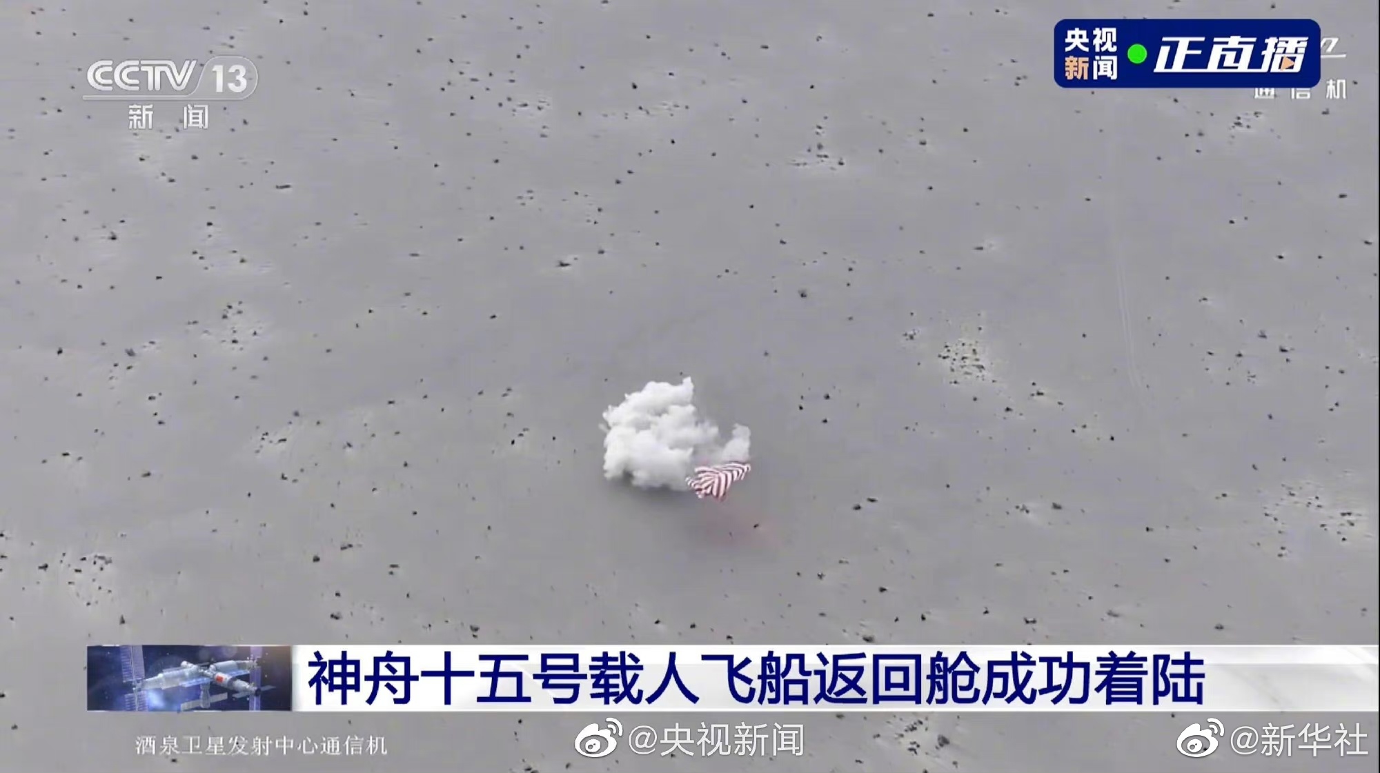 神舟十五号载人飞船返回舱在东风着陆场成功着陆。(记者:李国利 黎云 黄一宸)