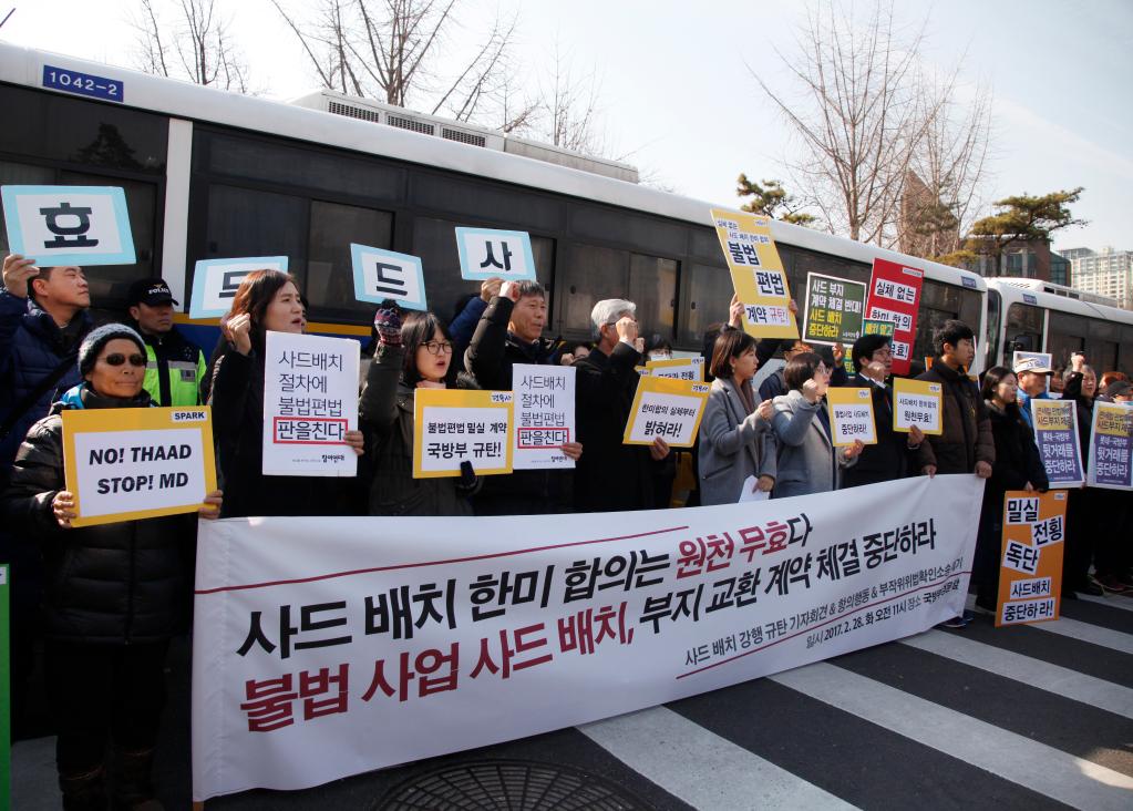 2017年2月28日,在韩国首尔的韩国国防部门前,韩国民众高举反对“萨德”系统的标语。新华社记者 姚琪琳 摄