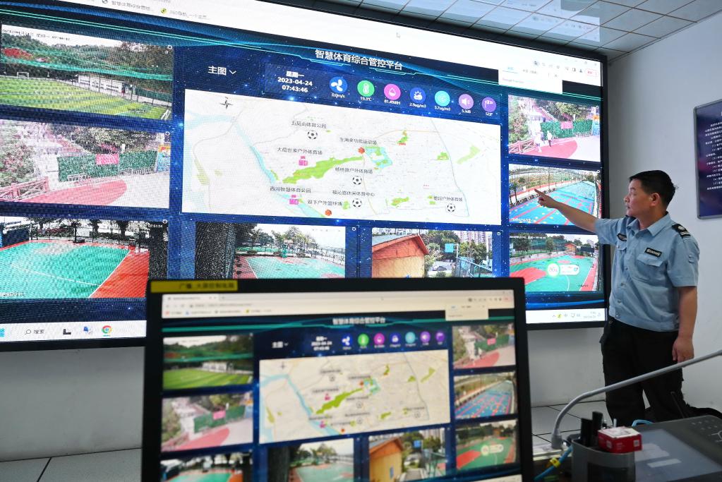 图为在福建省福州市,西河智慧体育公园工作人员在介绍智慧体育综合管控平台。新华社记者 林善传 摄