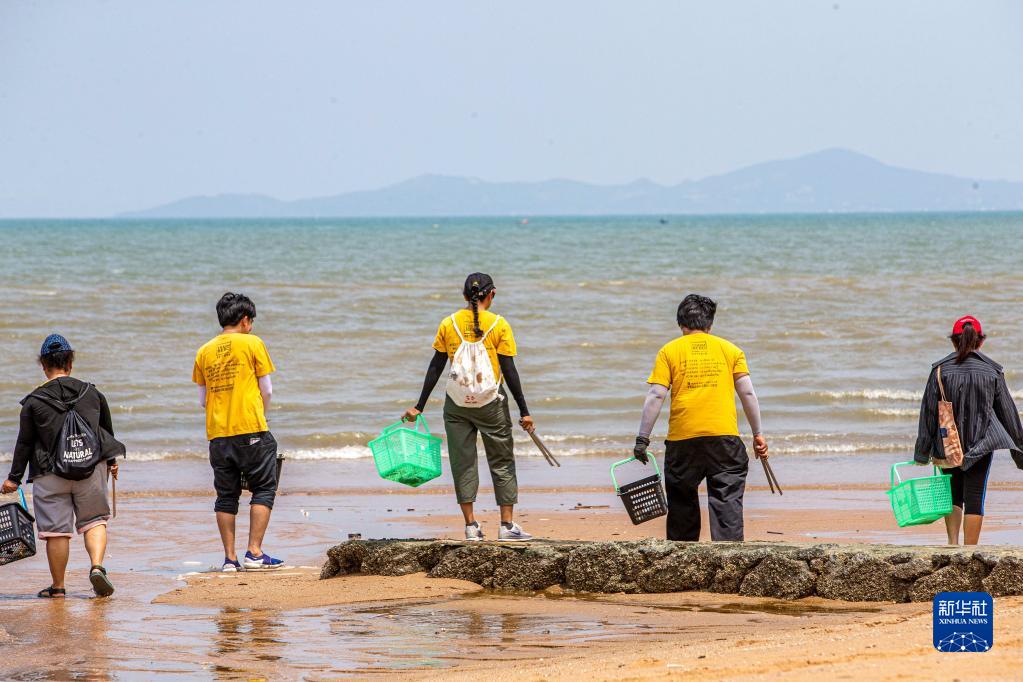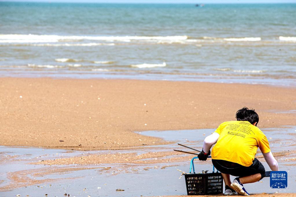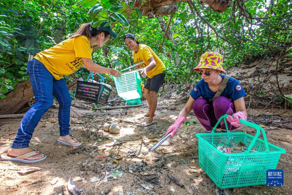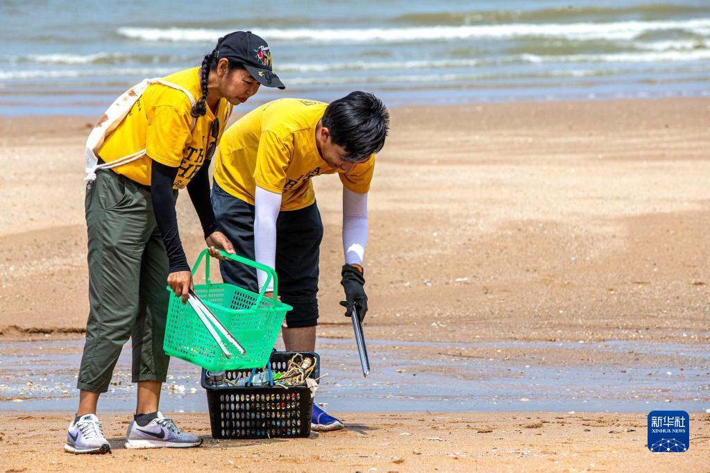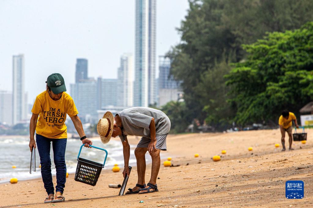 5月27日,志愿者在泰国芭提雅海滩上捡拾垃圾。新华社记者 王腾 摄
