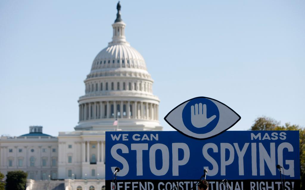 2013年10月26日,在美国首都华盛顿,一块反监控的大型标语牌竖立在国会大厦前。新华社记者方喆摄