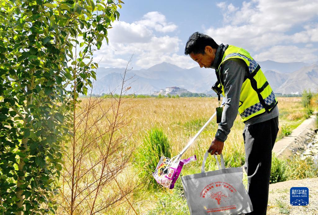 6月5日,在西藏拉萨拉鲁湿地国家级自然保护区,管护员嘎玛旺久在捡拾塑料垃圾。