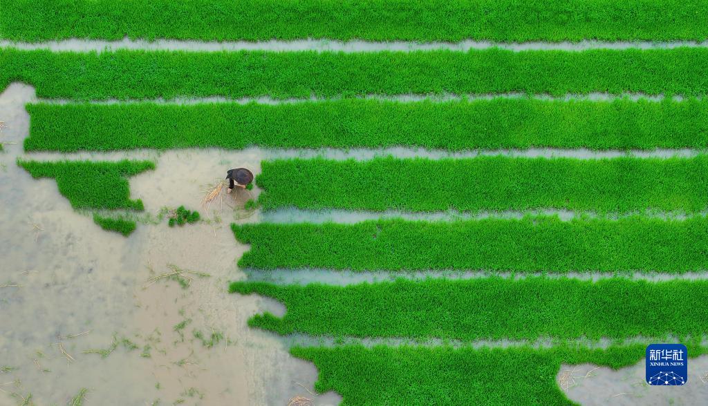 6月5日,村民在贵州省黔东南苗族侗族自治州岑巩县大有镇异溪村杂交水稻制种基地劳作(无人机照片)。