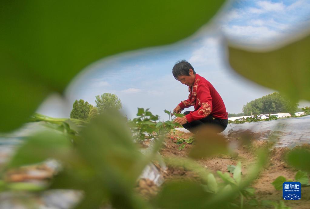 6月5日,村民在河南省商丘市夏邑县会亭镇西街北村田间补栽红薯苗。