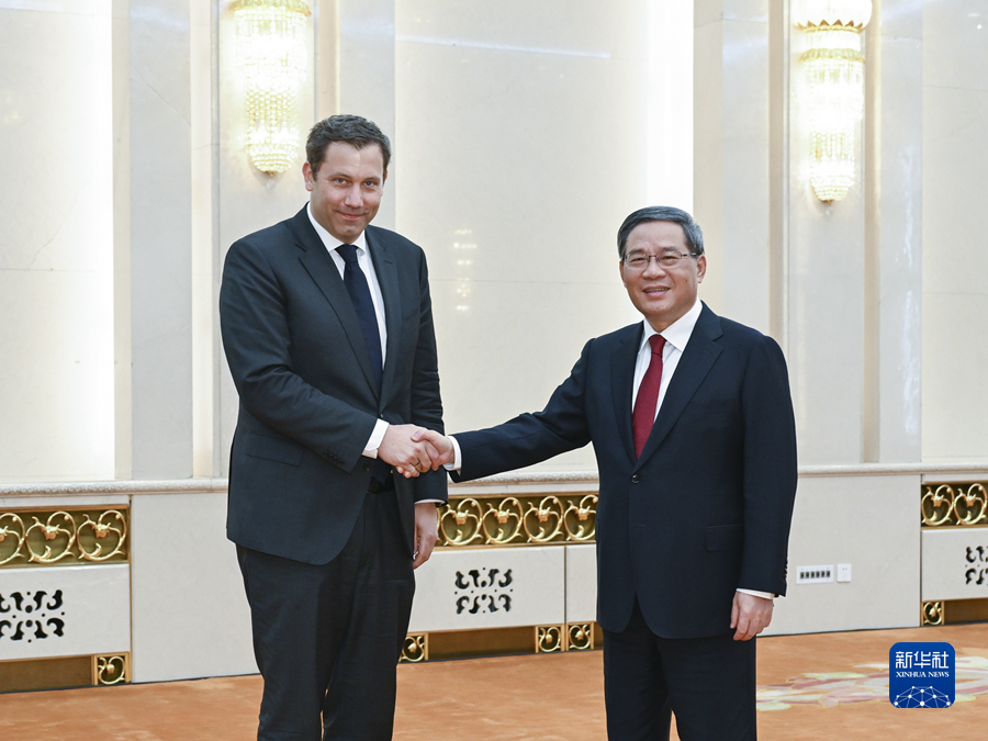 6月5日下午,中共中央政治局常委、国务院总理李强在北京人民大会堂会见由德国社会民主党联合主席克林贝尔率领的代表团。 新华社记者 张领 摄