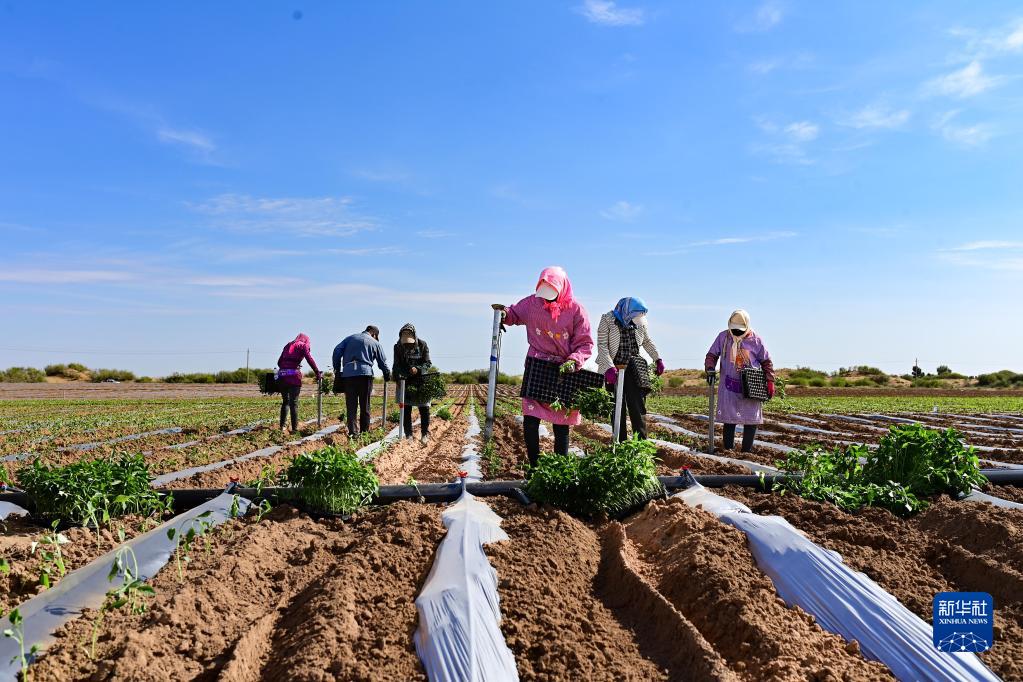 6月6日,农民在鄂托克前旗城川镇麻黄套村的辣椒地里栽种辣椒苗。