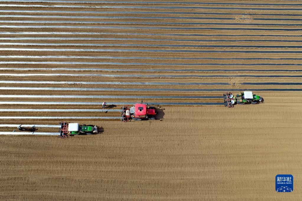 6月6日,农机在鄂托克前旗城川镇麻黄套村的辣椒种植基地里作业(无人机照片)。