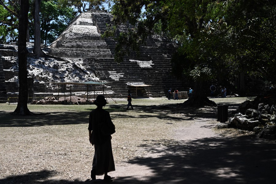 4月1日,游客在洪都拉斯科潘玛雅古城遗址内参观。中洪在当地展开考古合作。新华社记者辛悦卫摄