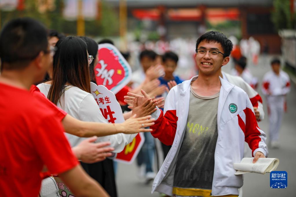6月7日,考生在贵州省毕节市民族中学考点和送考老师击掌。