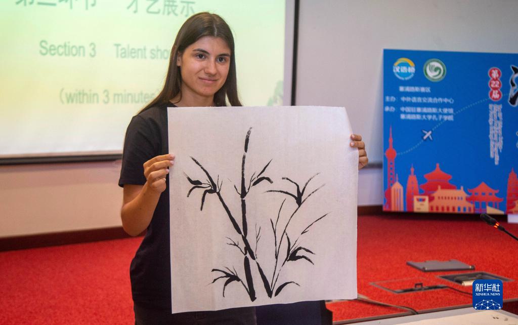 6月6日,在塞浦路斯首都尼科西亚,来自塞浦路斯大学的迪亚娜·伊万诺娃在“汉语桥”世界大学生中文比赛塞浦路斯赛区决赛上展示才艺作品。她最终获得本次比赛的冠军。