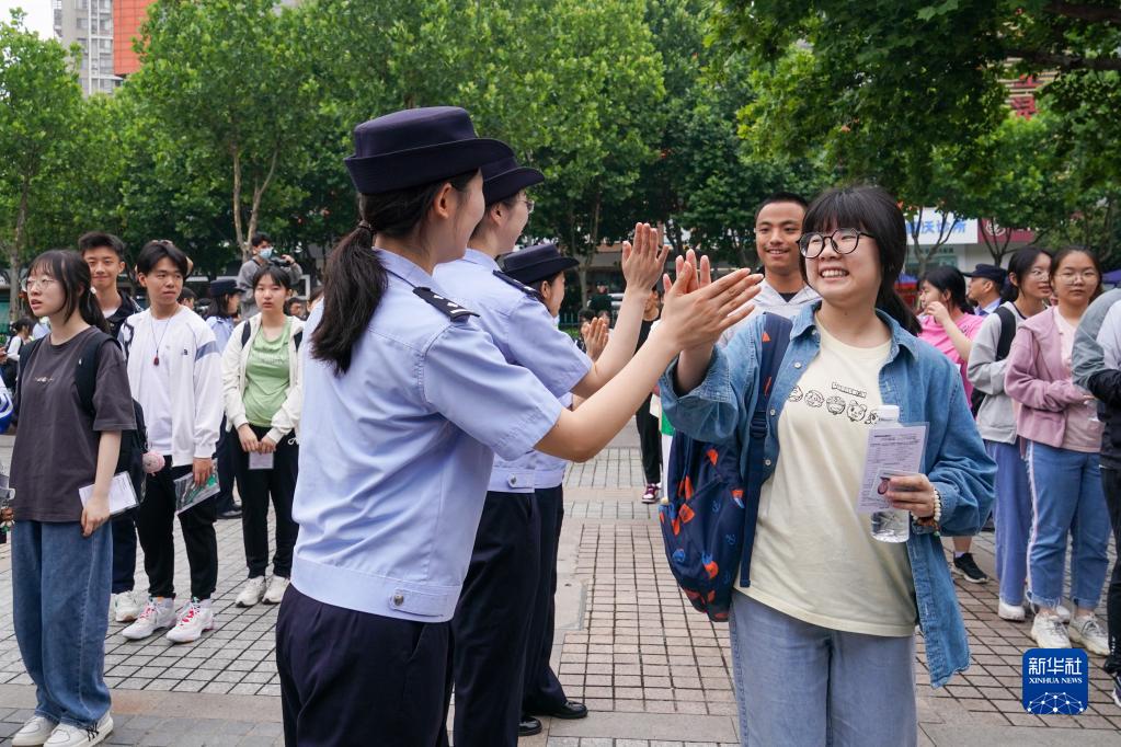 6月7日,在南京中华中学考点,准备进入考场的考生与执勤民警击掌。