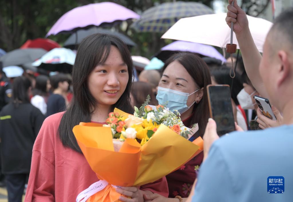 6月7日,福州金山中学考点的一位考生走出考场后父母为她送上了鲜花。