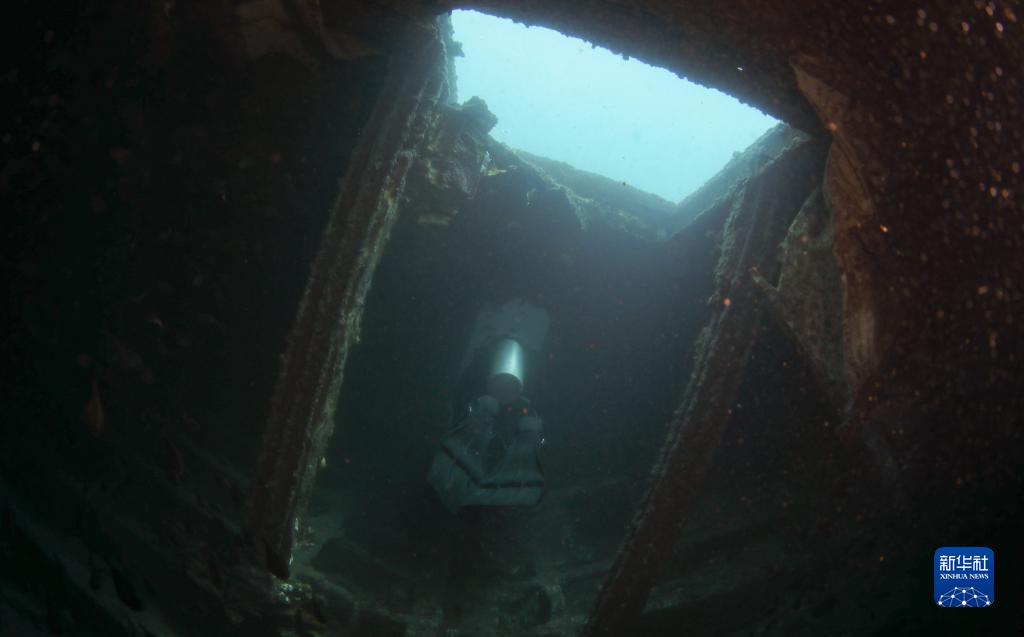 在蜈支洲岛海域海洋牧场,王丰国在巡护沉船鱼礁(2020年1月12日摄)。